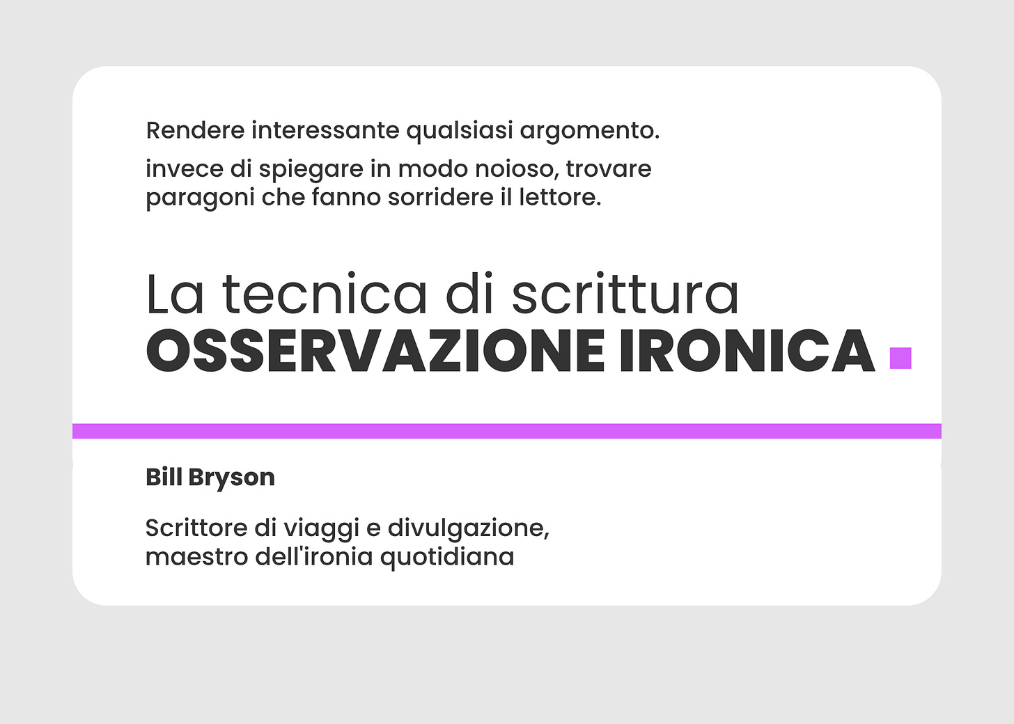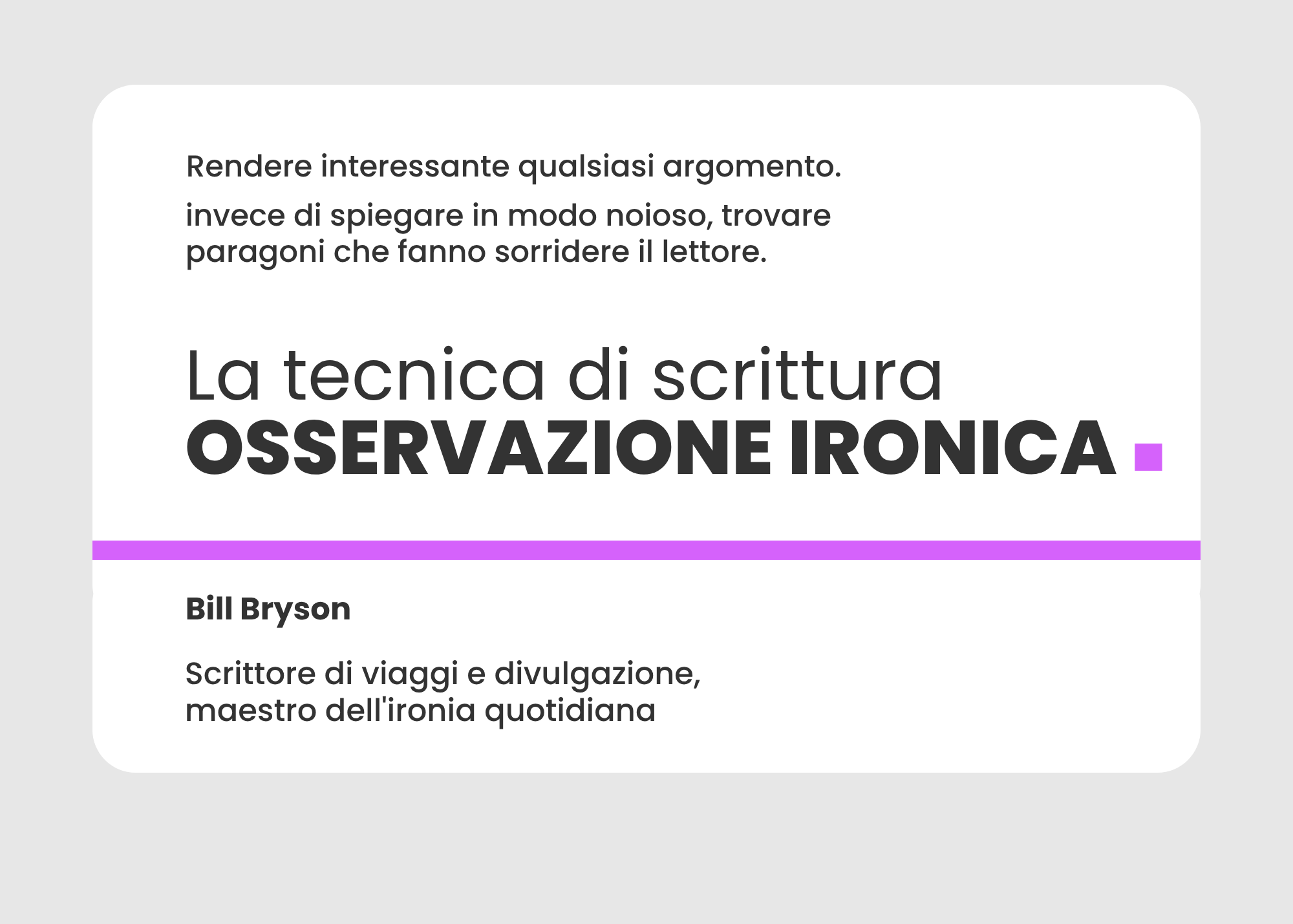La tecnica di scrittura “OSSERVAZIONE IRONICA CON PARAGONE INASPETTATO” trasforma qualsiasi argomento noioso in una lettura avvincente. Bryson prende un fatto o una situazione ordinaria, trova un paragone inaspettato da un ambito completamente diverso e conclude con un’osservazione leggermente ironica che fa sorridere il lettore e gli fa vedere le cose familiari sotto una nuova luce.
