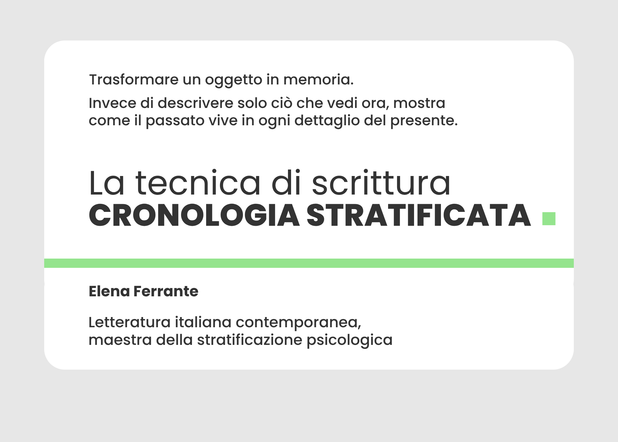 Il suo metodo — che chiameremo “CRONOLOGIA STRATIFICATA” — permette a qualsiasi oggetto o momento ordinario di rivelare profonde connessioni tra passato e presente. La Ferrante prende un dettaglio concreto del presente e conduce il lettore attraverso strati di ricordi, in cui ogni livello temporale aggiunge un nuovo significato all’oggetto iniziale. Il risultato: ciò che sembrava ordinario si rivela carico di storia personale e collettiva.