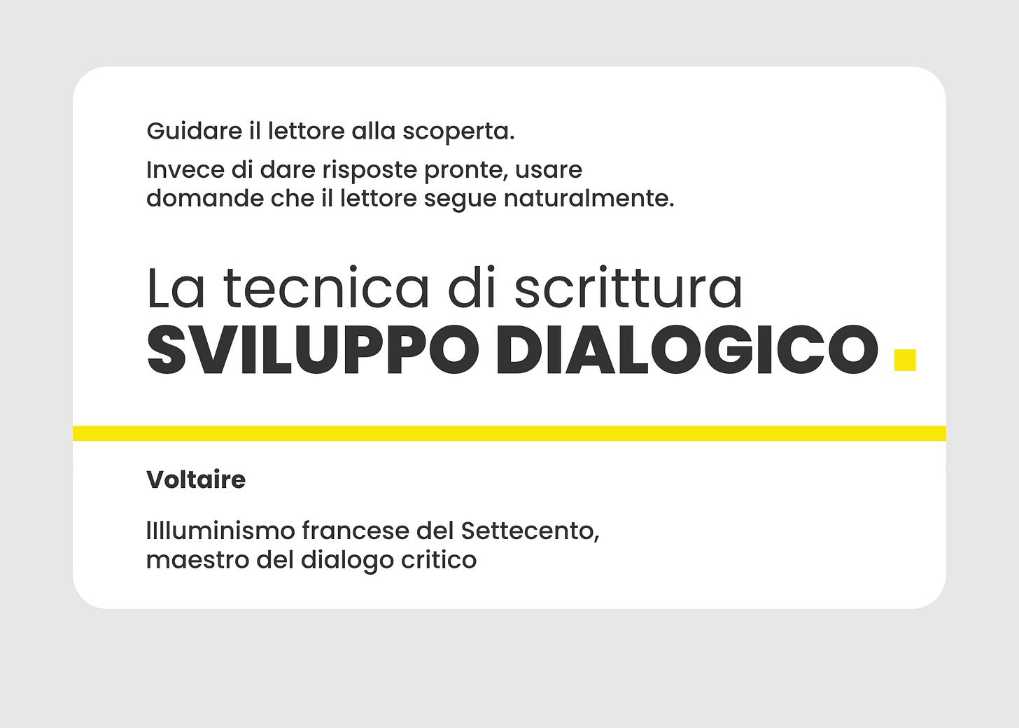 La tecnica si chiama “SVILUPPO DIALOGICO”. Voltaire non spiega. Chiede. Una domanda genera un’altra domanda, che genera un’altra ancora. Invece di dire al lettore cosa è importante, lo guidi attraverso una serie di domande naturali. Dopo tre o quattro passaggi, il lettore arriva alla risposta da solo — e la ricorda. Il lettore scopre da solo cosa rende speciale ciò che offri.